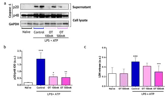 Caspase-1 expression and lactate dehydrogenase (LDH) release on peritoneal macrophages stimulated with LPS and ATP. (a) Representative image of Western blotting analysis of p20 and p48 subunits of caspase-1 expression on protein extracts from supernatants and cell lysates of peritoneal macrophages. (b) p20/p48 is expressed as arbitrary units (a.u.) of integrated optical density (IOD) (5 independent experiments). (c) LDH release was measured using a colorimetric assay (6 independent experiments). Data presented as mean ± S.D. +++ p < 0.001 versus naïve group; * p < 0.05, ** p < 0.01, and *** p < 0.001 versus control group. One-way ANOVA (Tukey’s post-test) in (a,c). OT: osteostatin.; LPS: lipopolysaccharide; ATP: adenosine triphosphate; LDH: lactate dehydrogenase.
