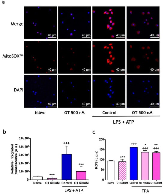 Levels of mitochondrial (a,b) and extracellular (c) reactive oxygen species (ROS) production by peritoneal macrophages. (a) Representative image of the fluorescence obtained via reaction with MitoSOXMT using an Olympus FV1000 confocal microscope; cell nuclei were counterstained in blue (DAPI). Scale bar = 40 μm. (b) Integrated intensity obtained from the ratio of mean fluorescence emitted via MitoSOXMT to cell area (4 independent experiments). (c) Extracellular ROS were measured via chemiluminescence in counted photons per second (cps) (6 independent experiments). Data presented as mean ± S.D. +++ p < 0.001 versus naïve group; * p < 0.05, ** p < 0.01, and *** p < 0.001 versus control group. One-way ANOVA (Tukey’s post-test) in (b,c). OT: osteostatin; LPS: lipopolysaccharide; ATP: adenosine triphosphate; TPA: 12-O-tetradecanoylphorbol-13-acetate.