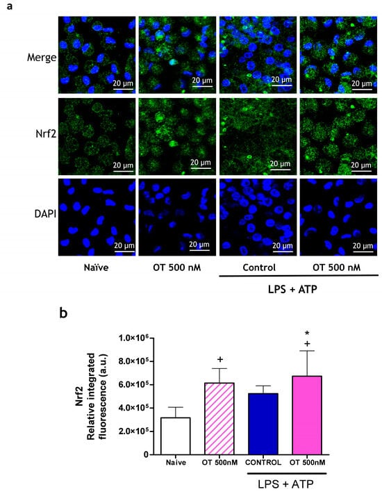 Nrf2 expression by peritoneal macrophages. Nrf2 nuclear translocation was determined via immunofluorescence of peritoneal macrophages stimulated with LPS + ATP in the presence or absence of osteostatin. (a) Representative confocal images of macrophages showing Nrf2 transcription to the nuclei (labeled in green). Cell nuclei were counterstained in blue (DAPI). Scale bar = 20 μm. (b) Integrated intensity obtained from ratio of mean fluorescence to cell area. Data presented as mean ± S.D. of 4 independent experiments. + p < 0.05 versus naïve group; * p < 0.05 versus control group. One-way ANOVA (Tukey’s post-test). OT: osteostatin; LPS: lipopolysaccharide; ATP: adenosine triphosphate.