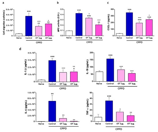 Cell migration (a), myeloperoxidase activity, (b) and pro-inflammatory cytokine (c,d) release in mouse air pouch (MAP) exudates. (a) Cell numbers in MAP exudates were measured with the use of a Coulter counter. (b) Myeloperoxidase (MPO) activity was determined via spectrophotometry O.D. (optical density, 450 nm). (c,d) Cytokines were measured via ELISA. Data were presented as mean ± S.D. n refers to the number of animals used in each group. n = 6 in the naïve group, and n = 8 in each of the following groups (the control, OT3µg and OT6µg groups). + p < 0.05, ++ p < 0.01, and +++ p < 0.001 versus the naïve group; * p < 0.05, ** p < 0.01, and *** p < 0.001 versus the control group. One-way ANOVA (Tukey’s post-test). OT: osteostatin; CPPD: calcium pyrophosphate dihydrate.