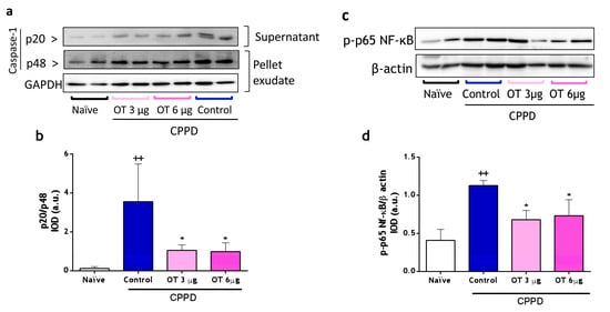 Caspase-1 and NF-κB expression in mouse air pouch (MAP) exudates. (a) Western blotting analysis of p20 and p48 subunits of caspase-1 expression on protein extracts from supernatants and cell lysates of MAP exudates. (b) p20/p48 is expressed as arbitrary units (a.u.) of integrated optical density (IOD). (c) Representative Western blotting analysis of p-p65-NF-κB expression in cell lysates of MAP exudates. (d) p-p65-NFkB/β-actin is expressed as arbitrary units (a.u.) of integrated optical density (IOD). Data presented as mean ± S.D. n = 4 in the naïve group and n = 5 in each of the following groups. ++ p < 0.01 versus the naïve group; * p < 0.05 versus the control group. One-way ANOVA (Tukey’s post-test). OT: osteostatin; CPPD: calcium pyrophosphate dihydrate crystals.