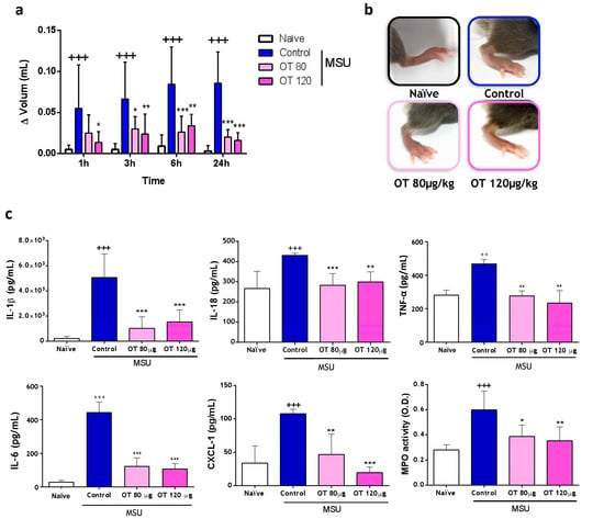 Edema in monosodium urate (MSU) crystal-induced gouty arthritis and cytokines levels and MPO activity in paw homogenates. (a) Assessment of edema induced by MSU crystals at different time points (1 h, 3 h, 6 h, and 24 h after MSU administration) with a digital plethysmometer. (b) Representative images of mice right hind paw at 24 h after MSU crystal administration. (c) Cytokines were determined via ELISA. Myeloperoxidase (MPO) activity was measured via spectrophotometry O.D. (optical density, 450 nm). Data presented as mean ± S.D. n = 6 in the naïve group and n = 8 in each of the following groups. +++ p < 0.001; ++ p < 0.01 versus the naïve group; * p < 0.05, ** p < 0.01, and *** p < 0.001 versus the control group. Two-way ANOVA with the Bonferroni post-test in (a) and one-way ANOVA with Tukey’s post-test in (c). OT: osteostatin.; MSU: monosodium urate crystals; MPO: myeloperoxidase.