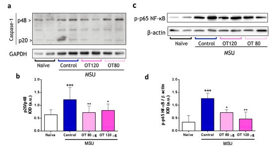 Effect of osteostatin on caspase-1 expression and p65 NF-κB phosphorylation in paw homogenates in monosodium urate (MSU) crystal-induced gouty arthritis. (a) Representative image of Western blotting analysis of p20 and p48 subunits of caspase-1 expression in protein extracts from paw homogenates. (b) p20/p48 is expressed as arbitrary units (a.u.) of integrated optical density (IOD). (c) Representative image of Western blotting analysis of p-p65-NF-κB expression in paw homogenates. (d) p-p65-NFkB/β-actin is expressed as arbitrary units (a.u.) of integrated optical density (IOD). Data presented as mean ± S.D. n = 4 in the naïve group and n = 5 in each of the following groups. +++ p < 0.001 versus the naïve group; * p < 0.05 and ** p < 0.01 versus the control group. One-way ANOVA (Tukey’s post-test). OT: osteostatin; MSU: monosodium urate crystals.