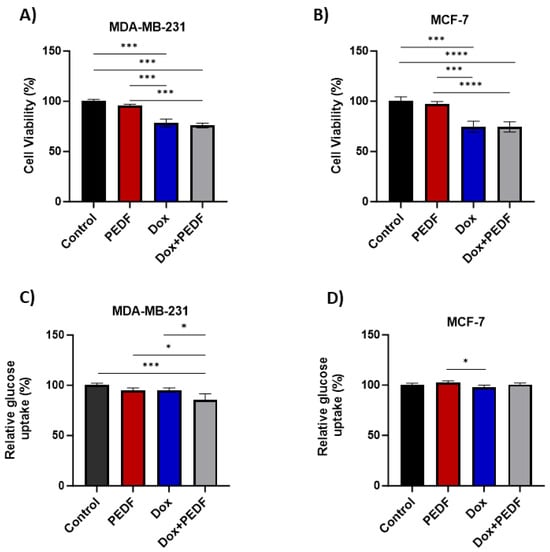 CellTitre Blue assay was used to determine the viability of (A) MDA-MB-231 and (B) MCF-7 exposed to PEDF (100 nM), Dox (0.5 µM), and Dox+PEDF. (C,D) Glucose uptake was further measured in MDA-MB-231 and MCF-7 following PEDF, Dox, and Dox+PEDF. PEDF, pigment epithelium-derived factor; Dox, doxorubicin. n = 4; (*) p ≤ 0.05; (***) p ≤ 0.001, and (****) p ≤ 0.0001.
