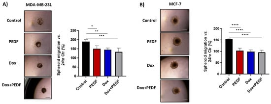 The migration of tumour cells assay was based on a tumour spheroid model. As shown in Figure 2A, MDA-MB-231 tumour cells in the control group exhibited a rapid migration along the plate away from tumour spheroids after 24 h. In contrast, the migration of tumour cells was dramatically inhibited by 24.47%, 23.13%, and 29.59% after tumour spheroids were treated with PEDF (p = 0.0144), Dox (p = 0.0063), and Dox+PEDF (p = 0.0009), respectively. While the combination of Dox+PEDF showed more reduction in cell migration, these differences were not significant between treated groups. Similarly, in the MCF-7 spheroid cultures, there was a notable reduction in migration distance in all three treatment groups by 32.60% for PEDF (p < 0.0001), 35.72% for Dox (p < 0.0001), and 37.28% for Dox+PEDF (p < 0.0001) when compared to the control (Figure 2B). Although Dox+PEDF showed a noticeable effect on inhibiting tumour migration, there were no significant differences between treatment groups.