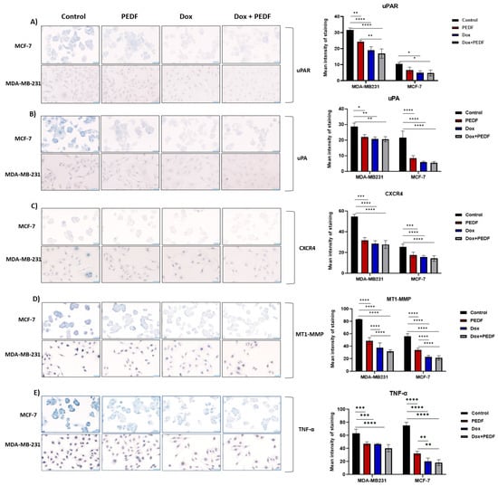 Metastatic markers expression via immunocytochemistry staining (blue) in MCF-7 and MDA-MB-231 cells following exposure to PEDF (100 nM), Dox (0.5 µM), and Dox+PEDF treatments, including (A) uPA, (B) uPAR, (C) CXCR4, (D) MT1-MMP, and (E) TNF-α. Graphs show the mean intensity of staining (blue). PEDF, pigment epithelium-derived factor; Dox, doxorubicin; uPA, urokinase-type plasminogen activator; uPAR, urokinase-type plasminogen activator receptor; CXCR4, C-X-C motif chemokine receptor 4; MT1-MMP, membrane-type 1 matrix metalloproteinase; TNFα, tumour necrosis factor. Significant differences were calculated using Tukey’s multiple compression tests and indicated as (*) p ≤ 0.05, (**) p ≤ 0.01, (***) p ≤ 0.001, and (****) p ≤ 0.0001. n = 4. Scale bar = 50 µM.