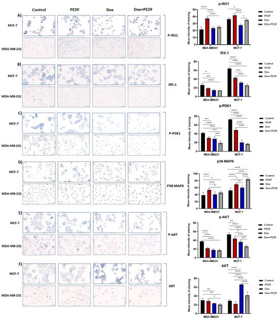 Cellular signalling markers expression via immunocytochemistry staining (blue) in MCF-7 and MDA-MB-231 following exposure to PEDF (100 nM), Dox (0.5 µM), and Dox+PEDF treatments, including (A) p-IRS1, (B) IRS-1, (C) p-PDK1, (D) p38-MAPK, (E) p-AKT, and (F) AKT. Graphs show the mean intensity of staining (blue). PEDF, pigment epithelium-derived factor; Dox, doxorubicin; p-IRS-1, IRS-1, insulin receptor substrate 1; PDK1, phosphoinositide-dependent kinase 1; p38-MAPK, p38 mitogen-activated protein kinases; AKT, serine/threonine kinase. Significant differences were calculated using Tukey’s multiple compression tests and indicated as (*) p ≤ 0.05, (**) p ≤ 0.01, (***) p ≤ 0.001, and (****) p ≤ 0.0001. n = 4. Scale bar = 50 µM.