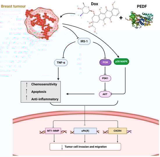 A schematic representation of the therapeutic effects of combining Dox+PEDF in BC treatment. It illustrates the pathway modifications induced by this combination strategy focusing on MAPK and PI3K/Akt pathways, which are important for cell growth and survival, through adjustments in the levels of IRS, PDK1, p38-MAPK, and p-AKT, which ultimately leads to reducing the levels of certain proteins (uPAR, uPA, CXCR4, TNF-α, and MT1-MMP) on stopping cancer spread. BC, breast cancer; PEDF, pigment epithelium-derived factor; Dox, doxorubicin; IRS-1, insulin receptor substrate 1; PDK1, phosphoinositide-dependent kinase 1; p38MAPK, p38 mitogen-activated protein kinases; AKT, serine/threonine kinase; uPA: urokinase-type plasminogen activator; uPAR, urokinase-type plasminogen activator receptor; CXCR4, C-X-C motif chemokine receptor 4; MT1-MMP, membrane-type 1 matrix metalloproteinase; TNFα, tumour necrosis factor.