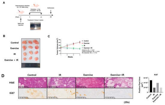 Six-week-old male Bagg Albino (BALB)/c athymic nude mice (Orient Bio, Seongnam, Republic of Korea) were used for the in vivo study. The animal experiment protocol used in this study was approved by the Pusan National University Institutional Animal Care and Use Committee (PNU-IACUC) for ethical procedures and scientific care (Approval Number PNU-2022-0060). The preclinical animal experiment consisted of four groups: control, radiation alone, aerobic exercise alone, and combination (aerobic exercise and radiation therapy). Five mice per group were placed in a sterile cage and maintained in an animal care facility in a temperature-regulated room (23 ± 1 °C) with a 12 h light/dark cycle and quarantined for 1 week prior to the study. The animals had access to water at all times and were fed a standard mouse chow diet.