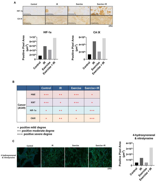 Oxygen distribution in tumor cells is an important factor for increasing radiation efficacy. To confirm whether aerobic exercise induces the “oxygen effect” in lung cancer cells, IHC was performed using hypoxia-inducible factor-1 α (HIF-1α) and carbonic anhydrase IX (CA IX) antibodies on mouse tumor tissue sections (Figure 2A,B).