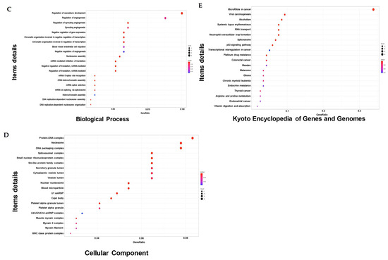 To determine the functions of the altered DEGs, gene ontology (GO) enrichment (biological process [BP] and molecular function [MF] of individual genes and their cellular components [CC]) and Kyoto Encyclopedia of Genes and Genomes (KEGG) analyses were performed. In the GO_BP analysis, the GO terms significantly altered by aerobic exercise were primarily involved in the regulation of vascular development and angiogenesis (Figure 3C). For the GO_CC analysis, the GO terms that were significantly altered by aerobic exercise were protein-DNA complexes, DNA-packing complexes, and nucleosomes (Figure 3D). In addition, aerobic exercise altered cancer-associated microRNAs (Figure 3E).