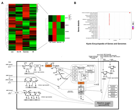 Additionally, we investigated genes that showed altered expression when aerobic exercise was combined with radiation. DEG analysis revealed that microRNA (miR)-106B expression was significantly increased in the combination group compared to the control group. In a recent study, miR-106B was found to be under-expressed in colorectal cancer (CRC), with miR-106B downregulation negatively associated with lymph node metastasis. MiR-106B has also been shown to inhibit CRC metastasis by regulating cathepsin A expression [54]. In this study, we focused on genes associated with oxygenation and ROS in the combination group; four of the altered DEGs were of interest. Gstm is the largest group in the GST family and comprises Gstm1–m5 according to the similarity of amino acid sequences [55]. According to Leonard et al., reoxygenation induced in the renal tissue following hypoxia-induced ischemia-reperfusion injury upregulates antioxidant genes, including Gstm5 [56]. These results indicate that reoxygenation activity is involved in regulating cell recovery and apoptosis under hypoxic conditions and that ROS may play an important role in this process. In addition, GSTM5 is expressed at low levels in human bladder cancer cells and tumor cell growth is inhibited when GSTM5 is overexpressed [57]. Interestingly, GSTM5 represents a robust predictor of the overall survival of patients with NSCLC [58]. Our analysis showed that Gstm5 expression increased by 4.78-fold in the combination group compared to the radiation-alone group.