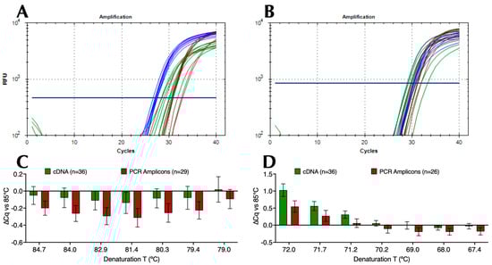 In addition to its central status as a research technique, the real-time polymerase chain reaction (qPCR) [,] has found extensive applied uses in clinical [], veterinary [] and agricultural [] diagnostics, as well as public health surveillance [,]. However, as molecular diagnostic applications continue to expand and evolve, traditional qPCR protocols and assay designs present inherent challenges for rapid results and point-of-care (PoC) applications. One particular limitation is the time it takes for qPCR instruments to ramp up and down the 35 °C temperature differential necessitated by the standard 95 °C denaturation/60 °C polymerisation protocol. There has been a focus on eliminating heating blocks, for example, through the use of microfluidic qPCR chips [,], continuous flow PCR [,] and plasmonic nanoparticles [,], but there has been a surprising lack of adjustment to the original protocols. This is despite the introduction of improved enzymes, reagents, and plasticware. Even extreme PCR protocols [,,] use high denaturation and low annealing temperatures. In practice, this means that, in combination with long dwelling times, a typical 40-cycle qPCR assay still takes 45 min to complete. This approach is clearly unsuitable for PoC applications, particularly in infectious disease diagnosis, where quick and accurate identification of the causative agent is crucial for effective treatment and containment. Additionally, in fields such as environmental monitoring [], food safety [], and forensic analysis [], reliable and rapid detection is crucial for timely decision-making and intervention. Whilst sample preparation remains a bottleneck within the PCR workflow, this issue is being addressed [,,,,,,], making it even more important to address the PCR step itself.