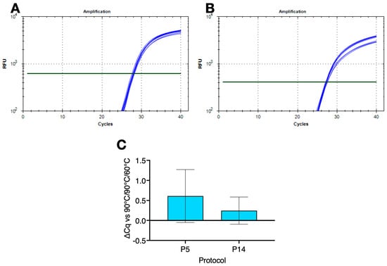 Amplification of S. aureus gDNA with B25 on denaturation or polymerisation gradients on a BioRad CFX Connect. (A) Amplification plots recorded on the denaturation gradient using protocol P12. Horizontal lines show the position of the threshold used to calculate Cq values. (B) Amplification plots on the polymerisation gradient using protocol P13. Horizontal lines show the position of the threshold used to calculate Cq values. (C) ∆Cq values (±95% CI) recorded with P5 (∆T = 9 °C) and P14 (∆T = 11 °C) versus protocol P1. All Cq values are listed in the Supplementary Data file.