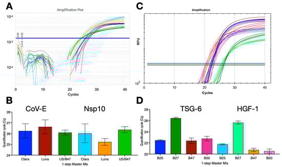 Many RT-qPCR reactions use a one-step format and since B47 was an efficient buffer for RTs, we assessed the ability of B47 to act as a combined RT and qPCR buffer. One-step RT-qPCR reactions were set up with SARS-CoV-2 gRNA targeting either the CoV-E assay or a previously described assay targeting the Nsp10 gene (45% G/C) []. The reactions were carried out with PCRBio’s Clara, NEB’s Luna or B47/UltraScript (US)/MyTaq master mixes using protocol R1 on the Techne Prime Pro 48 instrument. All 1-step RT-qPCR reactions worked equally well and recorded similar results for either target (Figure 4A,B). To test the compatibility with other buffers and assays, human breast cancer mRNA samples were reverse-transcribed with ES in four buffers, B25, B27, B47 or B50, targeting TSG-6 and HGF-1 in a 1-step RT-qPCR dual-plex assay on a BioRad CFX. B47 and B50 recorded the lowest Cq values, with B25 close behind and B27 working less well (Figure 4C,D).