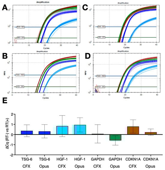 Repeatability of 1-step RT-qPCR protocols with and without dedicated RT steps and assays TSG-6 (blue), HGF-1 (light blue), GAPDH (green) or CDKN1 (brown). (A) Amplification plots recorded for 16 replicate reactions using RT+ protocol R2 on the BioRad CFX Connect. Horizontal lines show the positions of the FAM and HEX thresholds used to calculate Cq values. (B) Amplification plots recorded for 9 replicate reactions using RT+ protocol R2 on the BioRad Opus. Horizontal lines show the positions of the FAM and HEX thresholds used to calculate Cq values. (C) Amplification plots recorded for 16 replicate reactions using the no RT protocol R3 on the BioRad CFX Connect. Horizontal lines show the positions of the FAM and HEX thresholds used to calculate Cq values. (D) Amplification plots recorded for 9 replicate reactions using the no RT protocol R3 on the BioRad Opus. Horizontal lines show the positions of the FAM and HEX thresholds used to calculate Cq values. (E) ∆Cq values (±95% CI) of the reactions carried out with protocol R3 versus those carried out with protocol R2 (TSG-6 dark blue, HGF-1 light blue, GAPDH green, CDKN1A brown). All Cq values are listed in the Supplementary Data file.