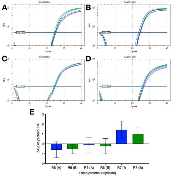 Comparison of 1-step RT-qPCR protocols with no dedicated RT steps coupled with FlashPCR protocol targeting SARS-CoV-2 gRNA. (A) Amplification plots recorded for replicate set-ups and reactions using protocol R4 (∆T = 30 °C) on a BioRad CFX instrument. Horizontal lines show the positions of the FAM and HEX thresholds used to calculate Cq values. (B) Amplification plots recorded for replicate set-ups and reactions using protocol R5 (∆T = 9 °C) on a BioRad CFX instrument. Horizontal lines show the positions of the FAM and HEX thresholds used to calculate Cq values. (C) Amplification plots recorded for replicate set-ups and reactions using protocol R6 (∆T = 10 °C) on a BioRad CFX instrument. Horizontal lines show the positions of the FAM and HEX thresholds used to calculate Cq values. (D) Amplification plots recorded for replicate set-ups and reactions using protocol R7 (∆T = 9 °C) on a BioRad CFX instrument. Horizontal lines show the positions of the FAM and HEX thresholds used to calculate Cq values. (E) ∆Cq values (±95% CI) of the various reactions versus those carried out with protocol R4 (∆T = 30 °C). All Cq values are listed in the Supplementary Data file.