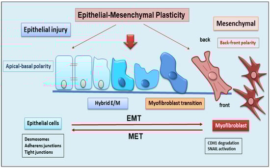 In recent years, our knowledge of the fibrotic process has been remarkably increased by the characterization of cellular mediators, key inflammatory and profibrogenic cytokines, molecular factors, and the evolution of new pathogenetic scenarios. A major determinant of fibrosis is the continuous spread of fibroblasts and myofibroblasts, which suggests the question of how this cellular system can be fed [32]. Experiments conducted in the last 2 years have shown that cellular plasticity, which also includes the phenomenon of EMP, is not limited exclusively to development; it also characterizes cells that undergo reprogramming that occurs during the repair of tissue damage, during fibrotic processes, and during carcinogenesis [26]. However, knowledge of the molecular mechanisms involved in the cell’s ability to modify its phenotype by evolving into another cell type is still at the beginning. The mechanisms underlying EMT are much more explored and known, and numerous studies have been conducted to evaluate the key role of EMT in fibrosis. In the context of identifying cellular drivers of fibrosis, various in vitro and in vivo studies have reported that EMT is a key mechanism during fibrogenesis, substantially contributing to the increase in interstitial fibroblasts and myofibroblasts, and interrupting its progression can have a profound impact on the onset and progression of related diseases, particularly fibrosis [21,33,34]. In fact, a fibrotic evolution of chronic diseases can lead to pathological states affecting various organs, including the lungs, liver, kidneys, heart, and salivary glands [35].The following paragraph summarizes the most recent discoveries derived from evaluating the molecular mechanisms underlying the process of EMT-dependent fibrosis in various organs in pathological conditions in order to identify potential therapeutic targets.