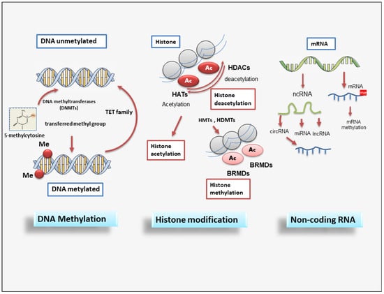 A schematic overview of epigenetic modifications. Epigenetic regulation involves DNA methylation, histone modification, and non-coding RNAs. DNMT family members mediate DNA methylation, which suppresses gene transcription by adding a methyl group to the cytosine position. Histone methylation is catalyzed by HMTs and HDMTs, and histone acetylation is regulated by HATs and HDACs. Non-coding RNAs include miRNAs, circRNAs, and lncRNAs. BET (Bromodomain and extraterminal); BRMDs (bromodomains); DNMT (DNA methyltransferase); HATs (Histone acetylases); HDACs (Histone deacetylases); HDMTs (Histone demethylases); HMTs (Histone methyltransferases); lncRNA (long non-coding RNA); TET (Ten-eleven translocation).