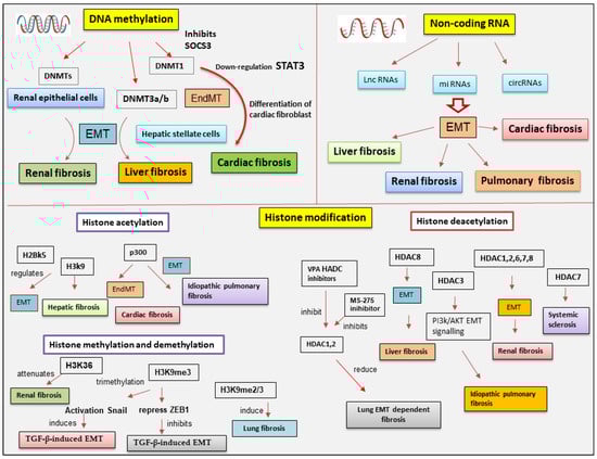 The studies conducted in order to evaluate a possible connection between epigenetics, EMP, and fibrosis are leading to the first discoveries, for example, in airway persistent inflammation [95], but require further investigation. On the contrary, the field of studies conducted on the role of epigenetic modifications in EMT-dependent fibrosis is much more flourishing. One of the hot topics in the last few years has been the association between epigenetic regulation and fibrotic processes triggered by EMT [13]. Epigenetic modulation of tissue–stroma interactions involves several types of alterations that have been shown in recent years to play a determining role in the activation of the EMT program and the consequent EMT-dependent fibrosis [13].The following paragraphs illustrate the current knowledge concerning the epigenetic aberrations involved in the fibrotic evolution induced by EMT during pathological processes.