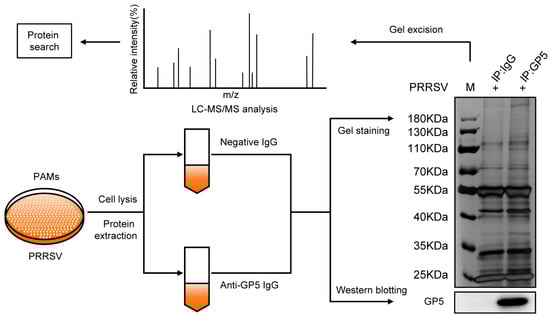 To analyze the potential host proteins interacting with GP5, PAMs (4.5 × 107 cells) were infected with PRRSV at an MOI of 1 for 36 h and then lysed using NP-40 lysis buffer with containing the PMSF (1 mM). Cell lysates were incubated with anti-PRRSV-GP5 mAb at 4 °C overnight and then incubated with protein A/G agarose for 4 h at 4 °C. After centrifugation, the supernatant was removed, and the pellets were suspended in a washing buffer. The centrifugation and resuspension processes were performed five times. Finally, the pellets were lysed in a lysis buffer. After SDS-PAGE electrophoresis, the gel was revealed by silver staining, and gel fragments were excised and identified by LC-MS/MS. LC-MS/MS were performed at Applied Protein Technology Biotechnology Co., Ltd. (Shanghai, China).