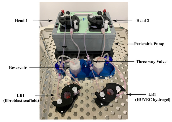 We used the system developed by IVTech (IVTech Srl, Ospedaletto, PI, Italy) to reproduce in vitro 3D models of endothelium and connective tissue in a dynamic environment simulating the blood flow. The system allows 2D and 3D cell culturing both in static and dynamic conditions. It provides two different transparent 24-well plate-like culture chambers: LiveBox (LB) Type 1 and Type 2. LB1 is equipped with a removable glass slide supporting the cell monolayer or 3D constructs and a flow inlet and outlet for the perfusion of culture media. LB2 allows the modeling of physiological barriers in vitro through a porous selective membrane (specific for each cell type) housed in a removable holder. It also has two flow inlets and outlets. For the purpose of setting up the best culture conditions, we employed only LB1 for culturing both fibroblasts and HUVECs. The bioreactors are designed for interconnected dynamic cell cultures thanks to their modularity that mimics the cross-talk between tissues, leading to a multi-organ simulation. A clamp system provided with the LBs assures the watertight closure of the chambers. A peristaltic pump (LiveFlow) connected to bioreactors and reservoirs applies an adjustable flow rate (range 100–450 μL/min) and enables cell–cell interactions through soluble molecules/proteins as they occur in vivo. Two removable pumping heads drive two independent circuits. Three-way valves positioned along the fluidic circuit allow the administration of drugs/modulators to the cells or the collection of conditioned media from the cultures at different sites of the system. Figure 1 shows the IVTech (IVTech Srl, Ospedaletto, PI, Italy) system assembled as required by the experimental plan.