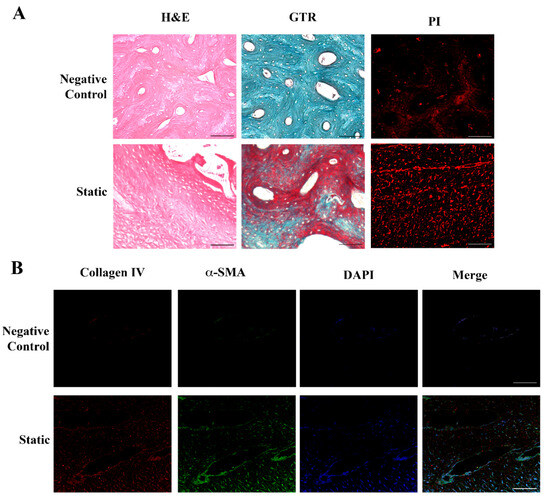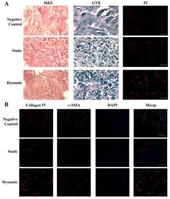 Histological and immunohistochemical analysis of fibroblasts seeded in the dermal scaffold. Panel (A) (Upper): negative control showing the acellular structure of the porcine dermal scaffold without fibroblasts either with H&E or GTR stainings. (Central): sections of the porcine dermal scaffold in the presence of human dermal fibroblasts cultured for 6 days in static conditions and stained with H&E or GTR showed an initial tissue remodeling with the random cellular distribution. (Lower): porcine dermal scaffold in the presence of human dermal fibroblasts cultured in static conditions for 6 days followed by 48 h under flow. Images showed a change in the tissue texture and cellular organization together with new collagen deposition. Nuclei were stained with PI. Original magnification 20×. Panel (B) (Upper): negative control. The initial deposition of collagen IV (red) and expression of α-SMA (green) visible in static conditions (Central) increased underflow, leading to the formation of a more organized tissue structure and consistent ECM deposition (Lower): dynamic. Nuclei were stained with DAPI (blue). Original magnification 20×. Scale bars correspond to 100 μm in all the images.