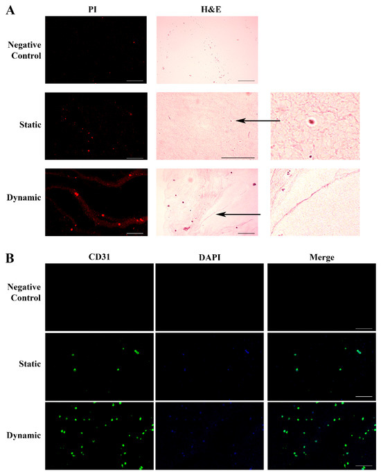 The cell growth into the hydrogel was evidenced by PI nuclear staining (red). No cellular texture was observed in the control hydrogel without cells. Endothelial cells cultured in static conditions spread across the hydrogel, leading to the development of early blood islands and the formation of infant tube-shaped structures. After culture medium perfusion, we observed an improvement of the cellular organization, with the fusion of the blood islands and their remodeling into better-defined tubular structures ending with the formation of the first primitive vascular plexus. The histology data were confirmed by the evaluation of the expression of CD31, a specific endothelial surface marker (Figure 4B).