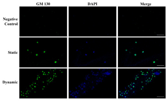 The vascular endothelium is made up of polarized cells and the structure, organization, and positioning of the Golgi apparatus are implicated in maintaining a polarized cell state [26]. We evaluated the expression and localization of the Golgi matrix protein 130 kDa (GM130), a structural element of the Golgi apparatus, in HUVECs grown in static and dynamic environments. As shown in Figure 5, in dynamic conditions, the Golgi apparatus (green) was clearly separated from the nuclei (blue) and oriented towards the front of the edge cell membrane, supporting the transition from non-polarized to polarized HUVECs in response to flow. No staining was observed in hydrogel without HUVECs (negative control).