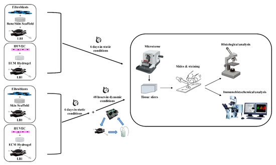 Flowchart of the 3D cell cultures. Fibroblasts were seeded in bone or skin scaffold and HUVECs were in the ECM hydrogel. The 3D cultures were maintained in LB1 for 6 days in static conditions. Concurrently, the same cell types were housed in LB1 in skin scaffold or ECM hydrogel, respectively, for 6 days in a static milieu and then exposed to 100 μL/min flow for a further 48 h. At the end of the culture period, samples were processed for histological or immunohistochemical analyses.