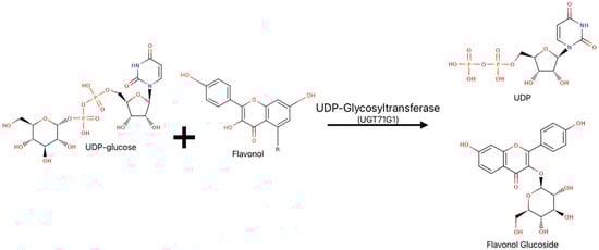 Flavonoids and triterpenes are natural plant metabolites that have several functions in both plants and animals, notably as antioxidants []. Quercetin is a 7-hydroxyflavonol and phytoestrogen abundant in edible plants and is glycosylated by both plant and animal UGTs [,]. UGT71G1 produces five different quercetin glycosides with the majority being quercetin-3-O-glucoside, which is also the main glycoside formed by UGT78G1 and UGT85H2 []. Quercetin-3-O-glucoside, like other flavonols, has improved stability in plant tissues, but remains an effective antioxidant serving a protective role in photo-induced oxidative stress [,]. Chloroplasts are protected by antioxidant glycosides, which scavenge oxygen singlets and other free radicals produced by long-term white light exposure [,]. In addition, UGT84A1 and several other Arabidopsis UGT transcription factors are found to be up-regulated by light exposure and the light stress-indicative waste product H2O2 []. The production of flavonoid-generating enzymes is also upregulated in these conditions, indicating that UGTs have significance in flavonoid regulation. More recently, it was found that silencing UGT genes in Populus tremula x P. alba (poplar) led to decreased flavonoid concentrations and increased lipid peroxidation, further demonstrating that glycosylation by UGTs is an important regulatory step in flavonoid biosynthesis [].