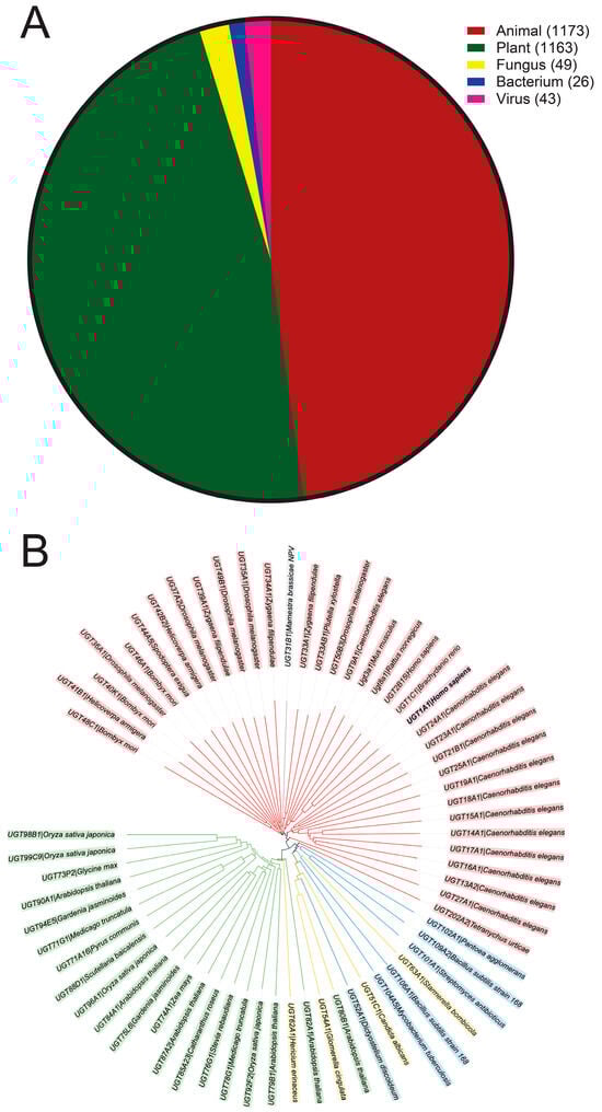 UGT homologs from different kingdoms. (A) Identified UGT homologs from different kingdoms. Information was collected from the database of the UGT Nomenclature Committee. The number of UGT homologs from each kingdom is shown. (B) Non-exhaustive phylogenic tree of UGTs with colors representing kingdoms. A range of UGT homologs were arbitrarily selected from each kingdom for this analysis, aiming to demonstrate the homology of UGT homologs from different kingdoms. Red/pink: animals; green: plants; blue: bacteria; yellow: fungi; gray: viruses; teal: other (amoeba). The tree structure was generated from UniProt using the Clustal Omega program (http://www.clustal.org/omega/; accessed on 8 November 2023) and modified with iTOL. UGT data are from UGT Nomenclature Committee 2023 UGT names files and UniProt.