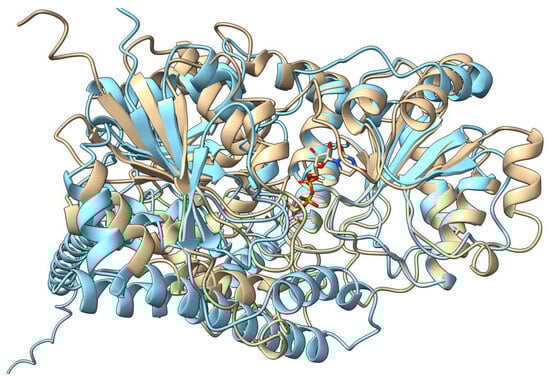 UGTs in mammals or humans are membrane-bound enzymes of the endoplasmic reticulum lumen, and therefore they contain transmembrane-spanning regions or motifs. By contrast, plant UGTs like UGT71G1 float freely in the cytoplasm []. X-ray crystal structures have been solved for a range of plant UGTs, such as UGT71G1 [], UGT78K6 [], UGT76G1 [], Bc7OUGT [], PaGT2 [], and UGT74AC2 []; these proteins have >25% homology and we found that they are structural homologs based on TM-align analysis []. Therefore, we used the structure of UGT71G1 as a representative plant UGT for comparing with human UGTs. On the other hand, due to the inherent difficulties of purifying and crystalizing membrane-bound proteins, no complete crystal models exist for UGT1A1 or any other mammalian UGTs []. However, existing models for UGT71G1 and other cytoplasmic UGTs have facilitated the creation of predictive models for UGT1A1, which may be used to compare structures and potential binding sites. The UGT71G1 crystal structure [] and the UGT1A1 AlphaFold2-predicted structure [] are superimposed as shown in Figure 3. The highest similarity is in the C-terminal region, which is presumed to be involved in the binding of the UDP-sugar donor, with greater divergence in their N-terminal domain, which normally binds the sugar acceptor []. Additionally, the closest human homolog to UGT71G1 is UGT3A1, which shares 25% homology. The AlphaFold2 prediction is also available for UGT3A1 (from UniProtKB; accession Q6NUS8). A structural comparison between UGT71G1 and UGT3A1 shows significant differences in surface loops and helices, but they still align well enough to show a common origin. The listed acceptor substrates are the flavonoids kaempherol and quercetin [], which are also substrates of UGT71G1 [].