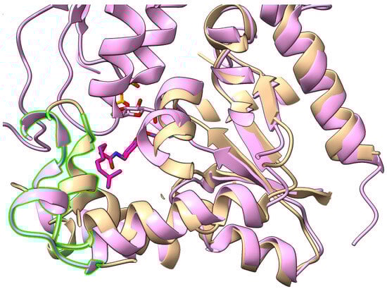 Size comparison of the acceptor-binding pocket of UGT71G1 with PaGT3. The highlighted helix of UGT71G1 (tan, PDB#: 2ACW) shows similarity in orientation with the highlighted portion of PaGT3 from P. americana (pink, PDB: 7VEL), relative to the capsaicin substrate of PaGT3 (dark pink). However, the helix in PaGT3 is positioned further away from the acceptor pocket, which corresponds to an increased pocket size in PaGT3 compared to UGT71G1, which allows binding to capsaicin.