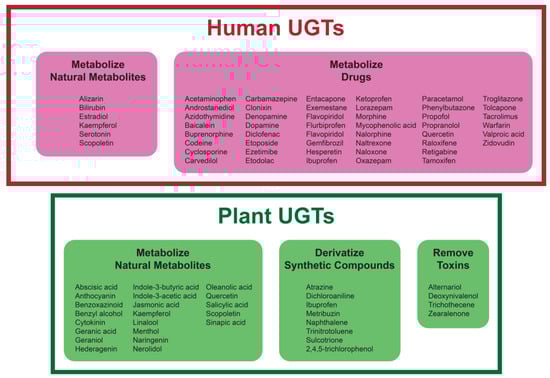 With these chemical activities, the roles of both plant and human UGTs include metabolizing endogenous metabolites and waste molecules and derivatizing exogenous compounds to reduce their toxicity [,]. Selected examples of UGT substrates for this biological functions are shown in Figure 6.