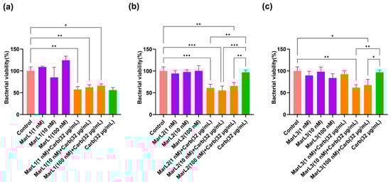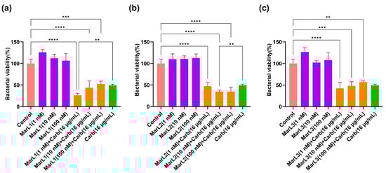 2.2. Combined Effect of a Maresin-like Mediator and Carbenicillin on Bacterial Viabilities in Their Biofilms