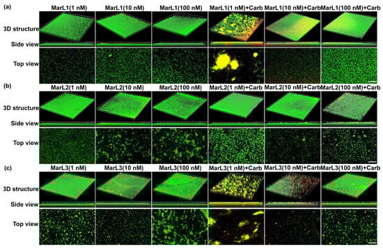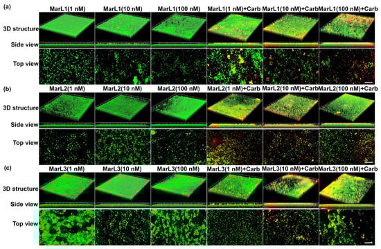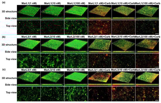 2.3. Live/Dead Assay Imaging Revealed Combined Effects of a Maresin-like Mediator and Carbenicillin on Bacterial Survival in Their Biofilms