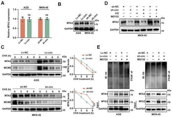 Xie, G.; Lei, B.; Yin, Z.; Xu, F.; Liu, X. CircMTA2 Drives Gastric Cancer Progression through Suppressing MTA2 Degradation via Interacting with UCHL3. Int. J. Mol. Sci. 2024, 25, 2817. https://doi.org/10.3390/ijms25052817