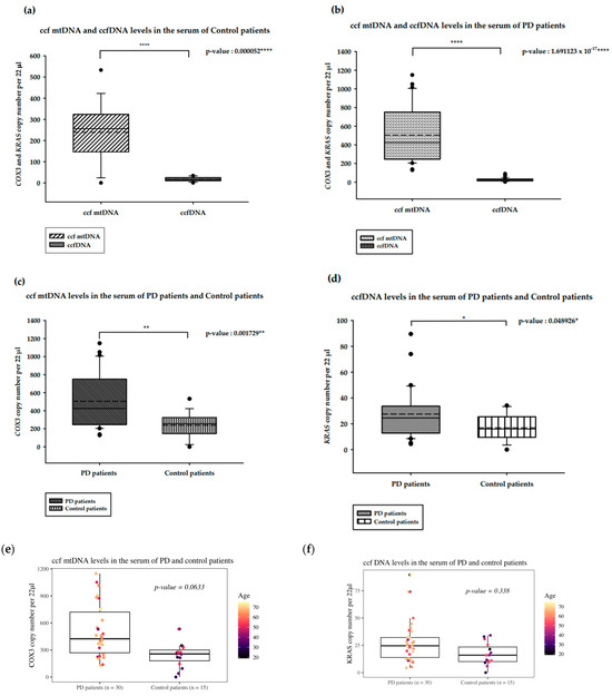 Results of the ddPCR analysis on serum ccf DNA from PD and healthy controls. (a). ccf mtDNA and ccfDNA copy numbers in the serum of healthy controls; (b). ccf mtDNA and ccfDNA copy numbers in the serum of PD patients; (c). ccf mtDNA copy numbers in the serum of PD and healthy controls; (d). ccfDNA copy numbers in the serum of PD and healthy controls; Boxplots represent medians (solid lines) and means (dashed lines) with min and max values. Mann–Whitney U tests were performed for comparison. A probability of ≤0.05 was considered statistically significant; * p ≤ 0.05, ** p ≤ 0.01, **** p ≤ 0.0001 (e). ccf mtDNA copy numbers in the serum of PD and healthy controls compared with ANOVA with age as a covariate; (f). ccfDNA copy numbers in the serum of PD and healthy controls compared with ANOVA with age as a covariate.