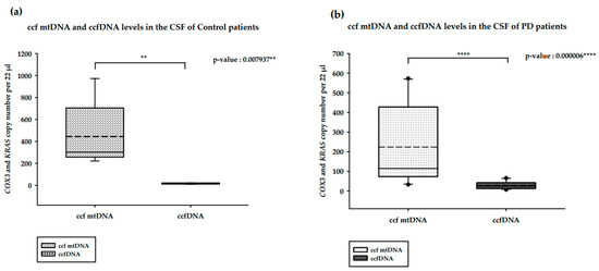It is worth highlighting certain results obtained for the serum and CSF of healthy controls. For both cases, the level of ccf mtDNA was statistically higher than that of ccfDNA, and differences were more significant in the serum. This may suggest that ccf mtDNA could be engaged in unknown regulatory processes, such as cell signaling, which again illustrates the need for further study of the role of mitochondria in ccf mtDNA biogenesis.