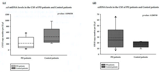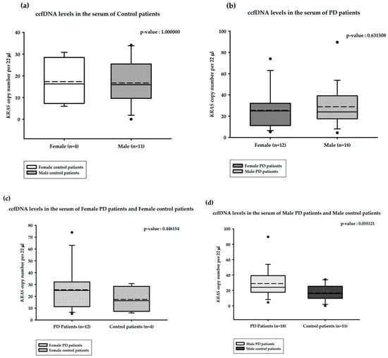 The correlations between serum ccfDNA and gender are presented in Figure 4. The median serum ccfDNA copy numbers in the healthy male (n = 11) and healthy female (n = 4) groups were 15.94 and 16.28 copies/22 µL, respectively. This difference was not statistically significant (Mann–Whitney U test, p-value = 1.000000; Figure 4a). The median serum ccfDNA copy numbers among female PD patients (n = 12) and male PD patients (n = 18) were 24.95 and 24.02 copies/22 µL, respectively, and this was also not a statistically significant difference (Mann–Whitney U test, p-value = 0.631508; Figure 4b). The median serum ccfDNA copy numbers in female PD patients (n = 12) and healthy females (n = 4) were 24.95 and 16.28 copies/22 µL, respectively; this difference was not statistically significant (Mann–Whitney U test, p-value = 0.446154; Figure 4c). The median serum ccfDNA copy numbers in male PD patients (n = 18) and healthy males (n = 11) were 24.02 and 15.94 copies/22 µL, respectively; this difference was statistically significant (Mann–Whitney U test, p-value = 0.055121; Figure 4d).