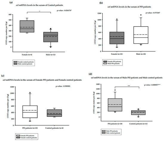 The correlation between serum ccf mtDNA and gender is presented in Figure 3. The median serum ccf mtDNA copy numbers among healthy males (n = 11) and females (n = 4) were 219.73 and 336.43 copies/22 µL, respectively. This difference was statistically significant, with increased copy numbers observed among the healthy females (Mann–Whitney U test, p-value = 0.026374 *; Figure 3a). The median serum ccf mtDNA copy numbers among female PD patients (n = 12) and male PD patients (n = 18) were 402 and 435.47 copies/22 µL, respectively, although this difference was not statistically significant (Mann–Whitney U test, p-value = 0.573247; Figure 3b). The median serum ccf mtDNA copy numbers among female PD patients (n = 12) and healthy females (n = 4) were 402 and 336.43 copies/22 µL, respectively, and this difference was also not statistically significant (Mann–Whitney U test, p-value = 0.598901; Figure 3c). The median serum ccf mtDNA copy numbers among male PD patients (n = 18) and healthy males (n = 11) were 435.47 and 219.73 copies/22 µL, respectively. This difference was statistically significant, with double the copy numbers seen in male PD patients (Mann–Whitney U test, p-value = 0.000857 ***; Figure 3d).