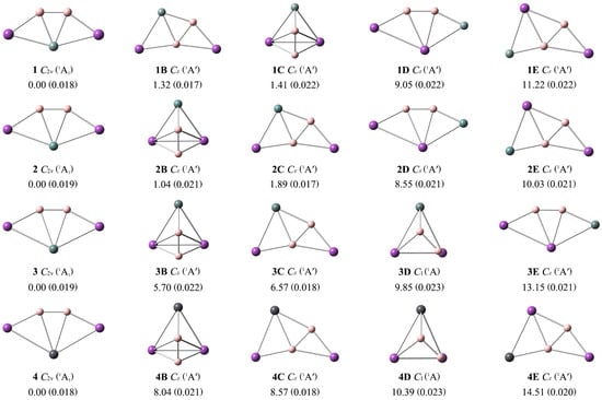 - Zhao, L.Q.; Guo, J.C.; Zhai, H.J. Ternary 14-Electron XB2Be2 (X = Si, Ge, Sn, Pb) Clusters: A Planar Tetracoordinate Silicon (ptSi) System and Its ptGe/Sn/Pb Congeners. Phys. Chem. Chem. Phys. 2022, 24, 7068–7076. [Google Scholar] [CrossRef] [PubMed]