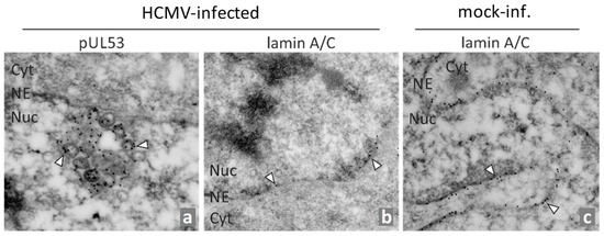 - Muranyi, W.; Haas, J.; Wagner, M.; Krohne, G.; Koszinowski, U.H. Cytomegalovirus recruitment of cellular kinases to dissolve the nuclear lamina. Science 2002, 297, 854–857. [Google Scholar] [CrossRef] [PubMed]