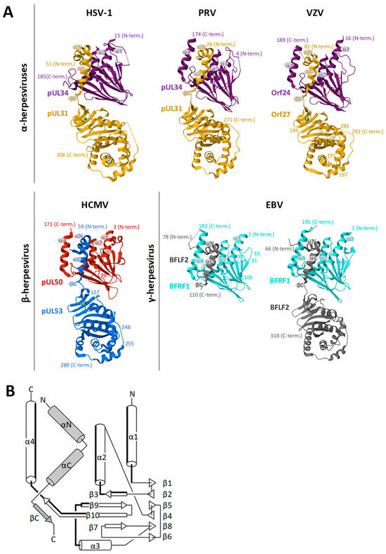 - Schweininger, J.; Kriegel, M.; Häge, S.; Conrad, M.; Alkhashrom, S.; Lösing, J.; Weiler, S.; Tillmanns, J.; Egerer-Sieber, C.; Decker, A.; et al. The crystal structure of the varicella-zoster Orf24-Orf27 nuclear egress complex spotlights multiple determinants of herpesvirus subfamily specificity. J. Biol. Chem. 2022, 298, 101625. [Google Scholar] [CrossRef]