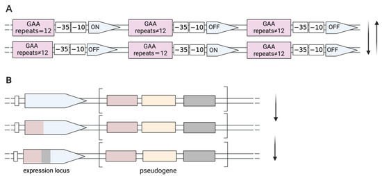 Genetic mechanisms directed towards phase and size variation of surface proteins with a high frequency. (A) ON/OFF switching by DNA slippage in M. gallisepticum. Spontaneously high-frequency mutations occur in the GAA trinucleotide motifs located upstream of the −35 boxes of the pMGA gene. Transcription of any pMGA gene occurs only when there are twelve GAA trinucleotide repeats. (B) Antigenic variations in M. synoviae occur through unidirectional recombination (gene conversion) that generates a chimeric-expressed gene, occurring between an expressed locus and pseudogenes, which are the reservoir sequence pools located in relatively closed clusters.