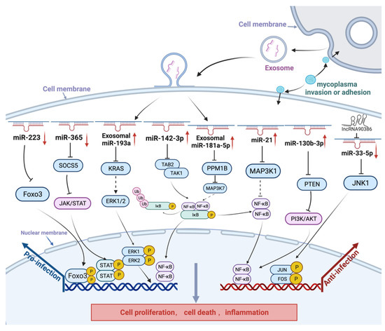 Following M. gallisepticum infection, exosomes secreted from M. gallisepticum-infected alveolar epithelial cells can cause or exacerbate lung inflammation and significantly increase TNF-α and IL-1β protein levels in DF-1 cells [95]. Gga-miR-193a content increased in exosomes to disturb distal cell proliferation, apoptosis, and cytokine production by targeting the KRAS/ERK signaling pathway [102] and gga-miR-451 was significantly reduced in exosomes, enhancing the inflammatory response in DF-1 cells, although gga-miR-451 expression was highly significantly upregulated in M. gallisepticum-infected CP-II cells [90]. In addition, the inflammatory response is critical in modulating the host’s immune response to pathogens such as bacteria, viruses, and parasites but a strong inflammatory immune response is an important cause of CRD. In the early stage of M. gallisepticum infection in cells, gga-miR-365-3p was upregulated and activated the JAK/STAT signaling pathway through inhibition of SOCS5 (suppressor of cytokine signaling 5), thus promoting the secretion of inflammatory factors, such as TNF-α and IL-6, and suppressing the expression of pMGA1.2. At the later stage of M. gallisepticum infection of cells, SOCS5 downregulates the expression of intracellular gga-miR-365-3p through a negative feedback mechanism, thereby reducing cellular inflammatory damage while promoting mycoplasma adhesion or invasion [71].