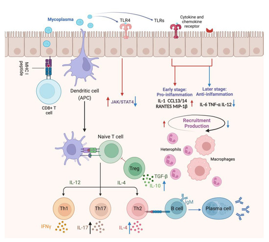 The immune response of the tracheal mucosa to M. gallisepticum infection in the respiratory tract. The red arrows indicate the modulation of early-stage immune mechanisms initiated upon infection, highlighting the induction of inflammation and recruitment of immune cells to the site of infection. M. gallisepticum attaches and colonizes the airway epithelium and is recognized by epithelial TLRs, initiating a TLR-mediated signaling pathway that regulates the expression of pro-inflammatory factors, including IL-1, CXCL13, CXCL14, RANTES, and MIP-1β, followed by the recruitment of macrophages and inflammatory cells to the local tissue. These recruited immune cells release inflammatory mediators to enhance host response and the secreted chemokines recruit naive B and T lymphocytes to the local tissue, where they are activated for subsequent adaptive immune responses. Conversely, the blue arrows illustrate the late stage of infection when M. gallisepticum acts to suppress inflammatory mediators and modulate the immune response, potentially suppressing inflammatory mediators such as IL-6 and TNF-α, influencing Th1 immune responses through the modulation of JAK/STAT4 pathway and cytokines correlated with cell-mediated immunity, such as IL-2 and IL-4, which prevents the host immune system from clearing the pathogen prematurely.