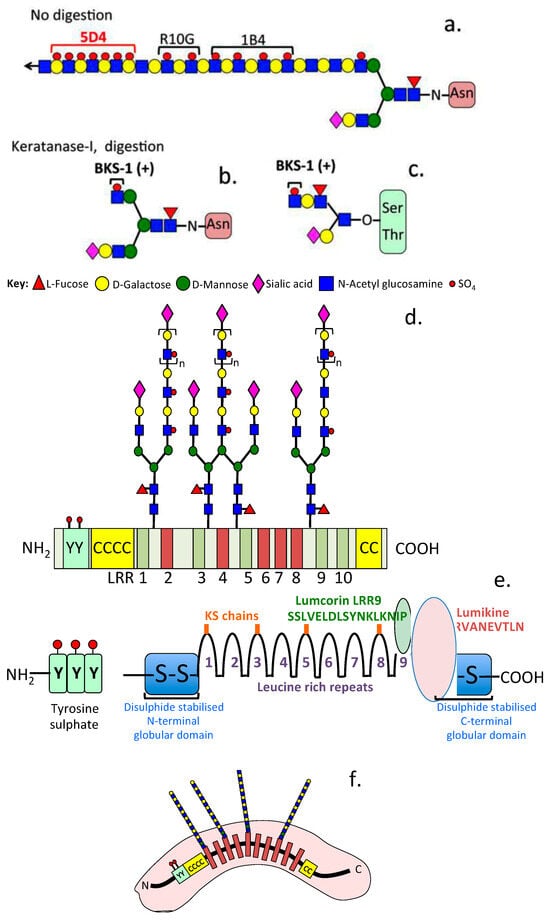 - Dunlevy, J.; Neame, P.J.; Vergnes, J.P.; Hassell, J.R. Identification of the N-linked oligosaccharide sites in chick corneal lumican and keratocan that receive keratan sulfate. J. Biol. Chem. 1998, 273, 9615–9621. [Google Scholar] [CrossRef] [PubMed]