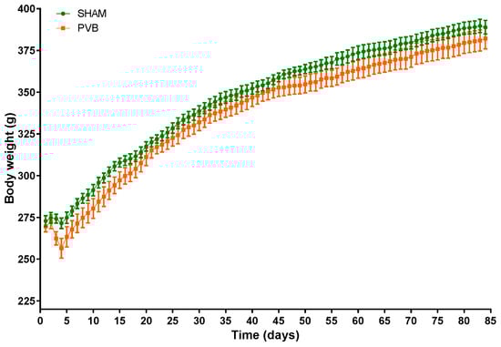 To assess the time course of changes in the heart and pulmonary vasculature induced by PVB, rats were subjected to either PVB (